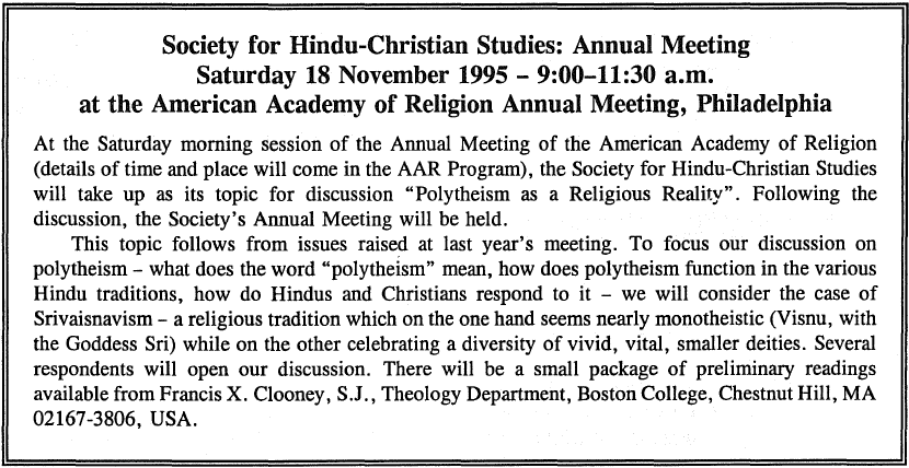 This was the society’s second Annual Meeting. The time and place of the meeting were published in the AAR/SBL program book without any specifics of the program. and other evidence of the program’s specifics is lacking. However, we do have an announcement of the meeting and a description of the topic from the Hindu-Christian Studies Bulletin (vol. 8, 1995), reproduced below.